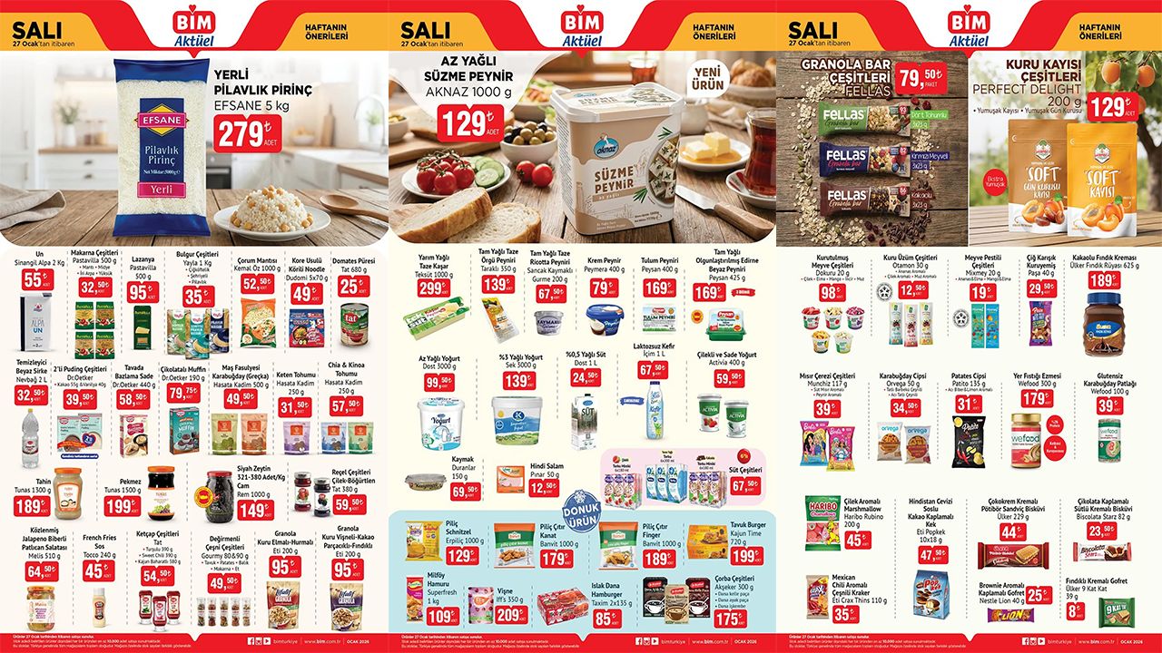 Milföy hamuru, vişne, ıslak dana hamburger, çorba çeşitleri, tavuk burger, piliç çıtır kanat, kaymak, hindi salam, yoğurt, süt, kefir, taze kaşar, az yağlı süzme peynir, tahin ve pekmez gibi ürünlerin yer aldığı 27 Ocak tarihinden itibaren geçerli olacak BİM kataloğu yayınlandı.